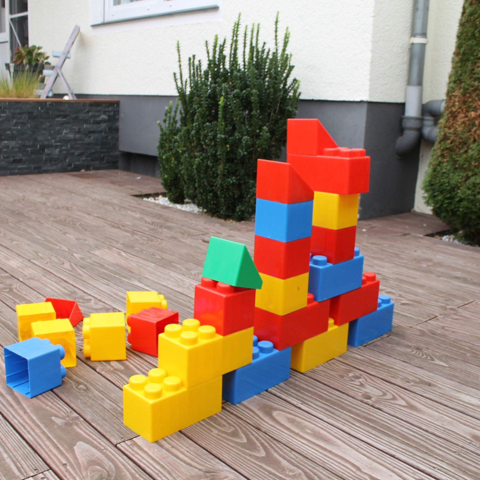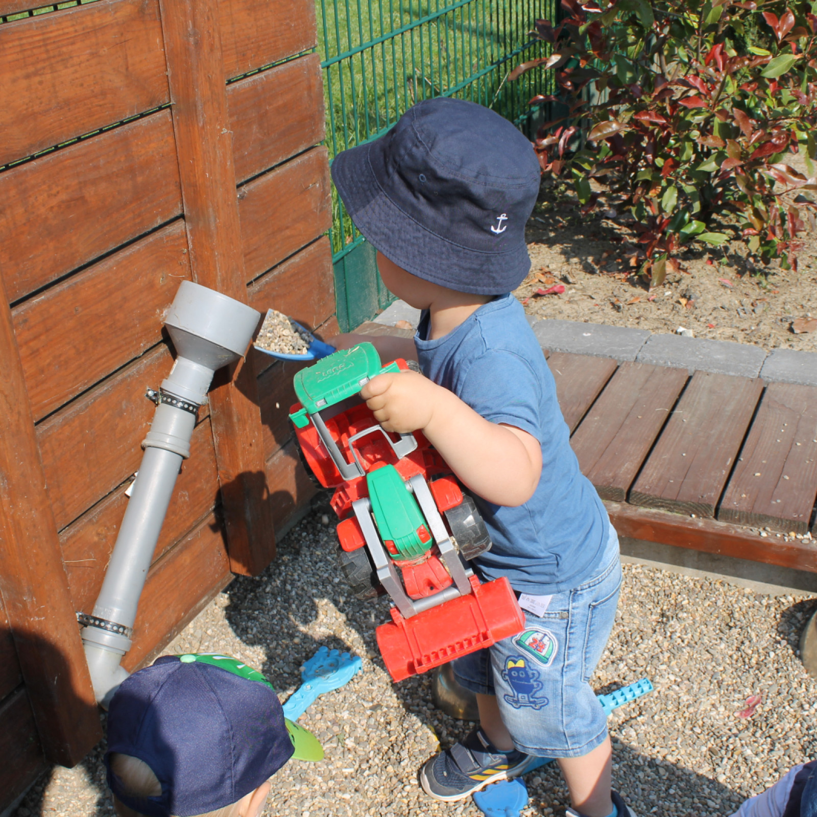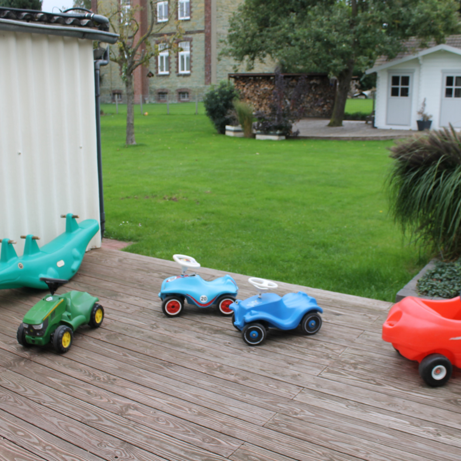 Unser großer Garten lädt ebenfalls zum Spielen ein. Dort gibt es verschiedene Schaukelmöglichkeiten, einen Krabbelberg, Rutsche, Kiesgrube, Bobby Cars und viele Spielzeuge für den Außenbereich.